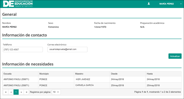 Al ingresar al Portal del Empleado del Departamento de Educación, el Recurso de apoyo recibirá una página con su identificación, su información de contacto y el listado de necesidades cubiertas: