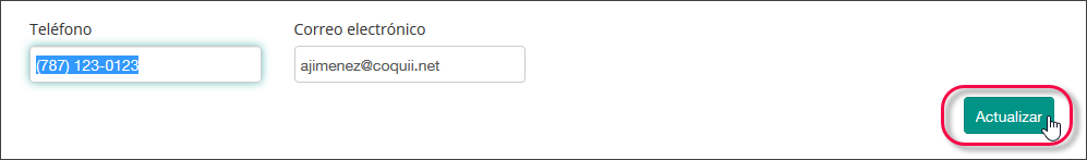 El Recurso de apoyo podrá actualizar su información de contacto cuando sea necesario. Para cambiar su número de teléfono o su dirección de correo electrónico, sustituya el dato existente por su nuevo valor y presione el botón de Actualizar. Por ejemplo, para cambiar su número de teléfono: