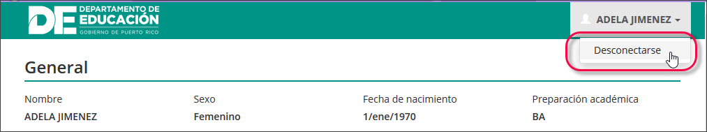 Para cerrar la sesión, se hará clic en la opción “Desconectarse”: